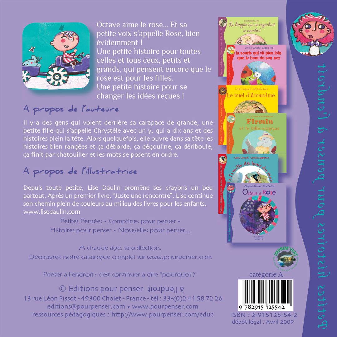Octave a une petite voix et elle s’appelle Rose… Mais pour sa copine Vanille, c’est n’importe quoi. En plus, le rose, c’est pour les filles, tout le monde le sait. Octave va argumenter et démontrer à son amie que l’on peut être un garçon, être sensible et aimer le rose.